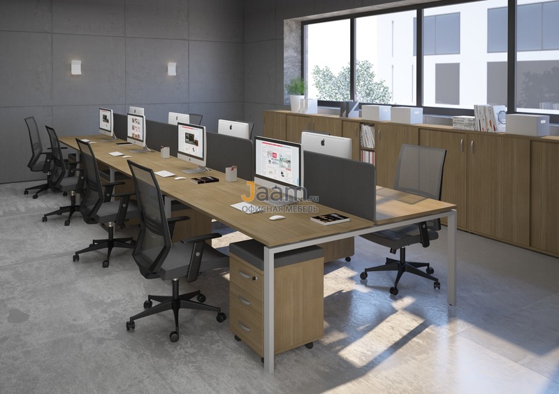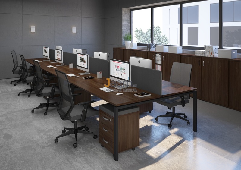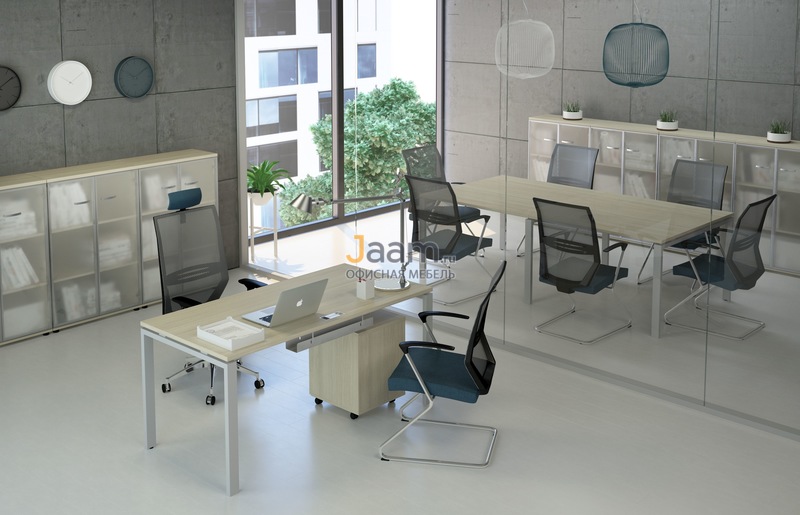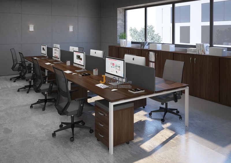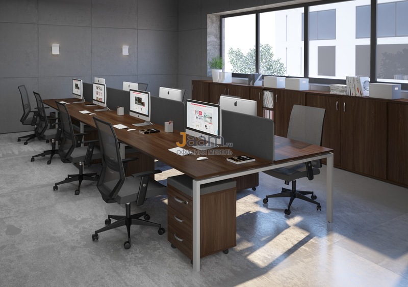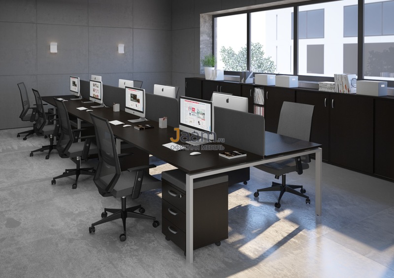 Простые формы, геометрически четкие конструкции – в мебельном ансамбле для персонала серии A4 все настраивает на продуктивный рабочий процесс. 0% декора, 0% отвлекающих деталей и 100% абсолютной функциональности – вот формула идеального комплекта для офисного интерьера. Использование металлических каркасов позволяет предметам A4 смотреться актуально в современной обстановке. Легкие линии, прозрачные стеклянные фасады добавляют ансамблю изящества. С помощью отдельных секций, приставных конструкций и экранов легко собираются композиции под определенное офисное пространство.